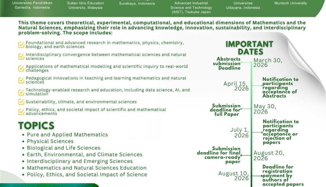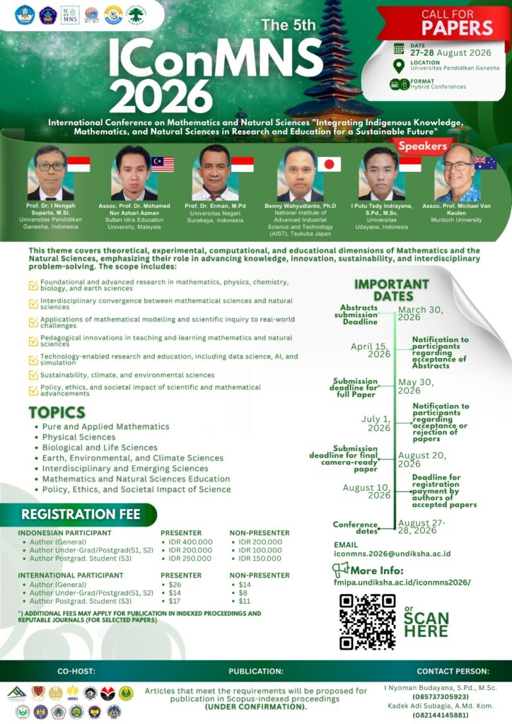 The Faculty of Mathematics and Natural Sciences, Universitas Pendidikan Ganesha proudly invites researchers, academics, practitioners, and students to participate in The 5th International Conference on Mathematics and Natural Sciences (IConMNS 2026).